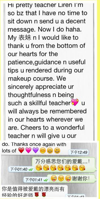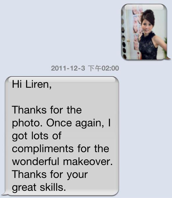 Hi Liren really ought to say a BIG THANK YOU 2u. I simply cant bear to remove my make-up i feel so damn swee lor :) u gave me a wonderful evening with loads of praises n admiration. I never felt this amazing. I may be fat but all those lovely praises made me feel so light.. haha thks for ur pair of miracle hands n ur professionalism. I wouldnt hesitate recommending u to my friends. Wishing u a properous year ahead and may all ur days be beautiful :)