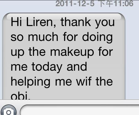 Hi Liren, tks for e makeup! We'v enjoy our day and everyone's comments was gd. We reli like it. Once e pic is developed I'll let put up on friendster and show u. Tks once again. Keep in contact!