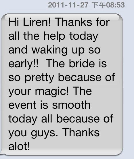 Hi liren, just want to say thank you for your help on my wedding day. Everyone said my sister and i looked wonderful. Take care and we will recommend you to all our friends.