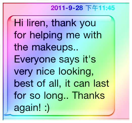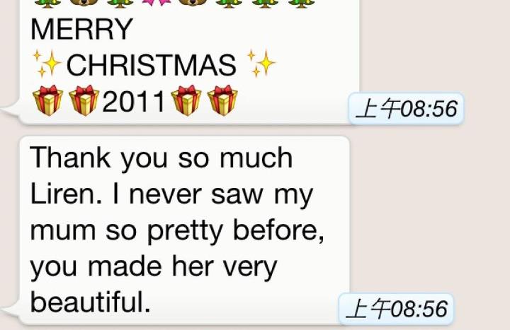 Hi Liren thanks for making me n my mom so beautiful last nite :) u r fantastic!.